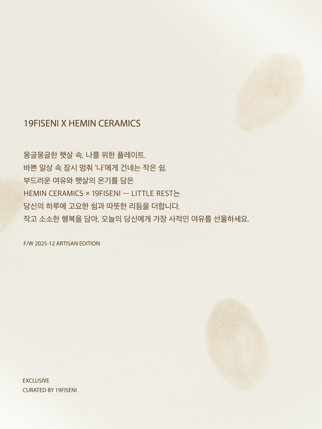 HEMIN CERAMICS × 19FISENI — LITTLE REST 일상의 작은 틈에서 시작되는 부드러운 여유. 보금자리처럼 편안한 감성을 담은 퓨어 화이트. 가벼운 브런치부터 따뜻한 디저트까지, |