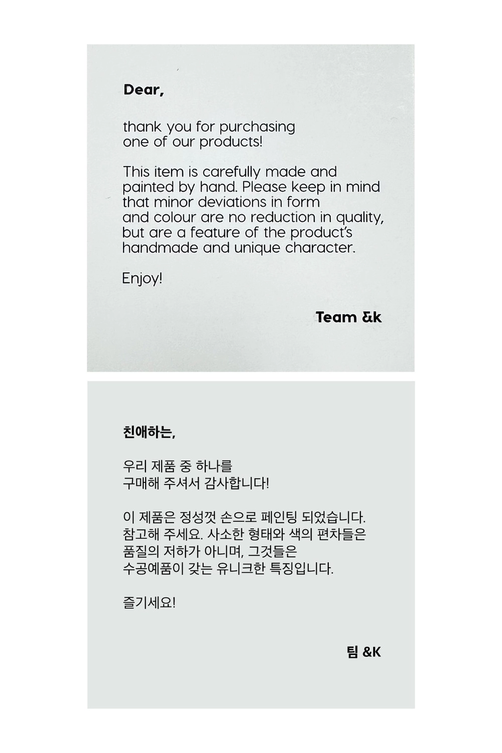 보관 및 세척 방법 - 식기세척기 사용 가능. 전자레인지 사용이 불가입니다. - 컴퓨터, 모바일 기기의 종류에 따라 실제 상품의 색상과 다르게 보일 수 있습니다. - 제작 과정, 재는 방법에 따라 표기된 사이즈와 실측 사이즈가 상이할 수 있습니다. - 소재 특성상 발견되는 현상은 모두 정상 범주로, 교환/환불의 사유가 되지 않습니다. * 구매 전 참고하시고 신중한 구매 결정 부탁드립니다. [핸드메이드 제품 유의사항] - 기계로 찍어내는 공산품이 아닌 100% 핸드메이드 제품으로 완성된 제품마다 사이즈, 색상, 디자인 등에서 약간의 오차가 있을 수 있습니다. 이는 결함으로 간주하지 않으며 오히려 장인이 만든 제품에 가치를 더하는 특성으로 간주합니다. [도자기 제품 유의사항] - 유약 과정에서 생기는 뭉침, 흐름, 또는 두께가 상이할 수 있습니다. - 제작 과정에서 생기는 기포로 인한 유약의 빈틈(시유 집게 자국, 시유 및 가마 소성 발생하는 기포 자국)이 있을 수 있습니다. - 가마 소성 과정에서 점토로 인해 생기는 작은 요철(돌기)이 발생할 수 있습니다. - 흙 또는 유약에 포함된 철 성분으로 인한 미세한 검은 점 및 잡티가 있을 수 있습니다. - 바닥 굽 부분 칩 현상(가마 소성 시 발생하는 굽 파임, 미세한 찍힘 및 피놀자국)이 있을 수 있습니다. [도자기(핸드페인팅) 제품 유의사항] - 핸드페인팅은 일정한 두께로 칠해지지 않음으로 뭉침, 흐름 또는 두께가 상이할 수 있습니다. - 핸드페인팅으로 색의 농도, 색감 차이, 패턴의 크기 차이가 상이할 수 있습니다. - 미세한 물감 및 안료 튐 현상(예시: 갈색 또는 페인팅 색점)이 있을 수 있습니다. [유리 제품 유의사항] - 일부 제품은 마우스 블로오 공법(입으로 불어 만드는)으로 제작되어 두께, 모양이 완벽히 대칭/균일하지 않을 수 있습니다. - 제작 과정에서 줄 모양의 스크래치나 기포(공기주입 구멍) 등이 발생하는 현상을 쿼드라고 합니다. 성형 과정 중 유리가 식으면서 발생하는 자연스러운 현상입니다. - 공정 시 온도 차에 따라 발생하는 쿼드 현상으로 인한 진한 라인은 파손과 무관한 부분이며, 미세한 검은 점 및 잡티는 사진상으로 보이는 것보다 진할 수 있습니다. - 유약 과정에서 생기는 뭉침, 흐름, 또는 두께가 상이할 수 있습니다. - 가마 소성 과정에서 점토로 인해 생기는 작은 요철(돌기)이 발생할 수 있습니다. - 바닥 굽 부분 칩 현상(가마 소성 시 발생하는 굽 파임, 미세한 찍힘 및 피놀자국)이 있을 수 있습니다. - 액체 상태의 유리로 제작되는 제품 제작 특성상 마감 부분이 매끄럽지 못하고 위로 솟아올라 있거나, 아래로 내려앉아 있을 수 있습니다.