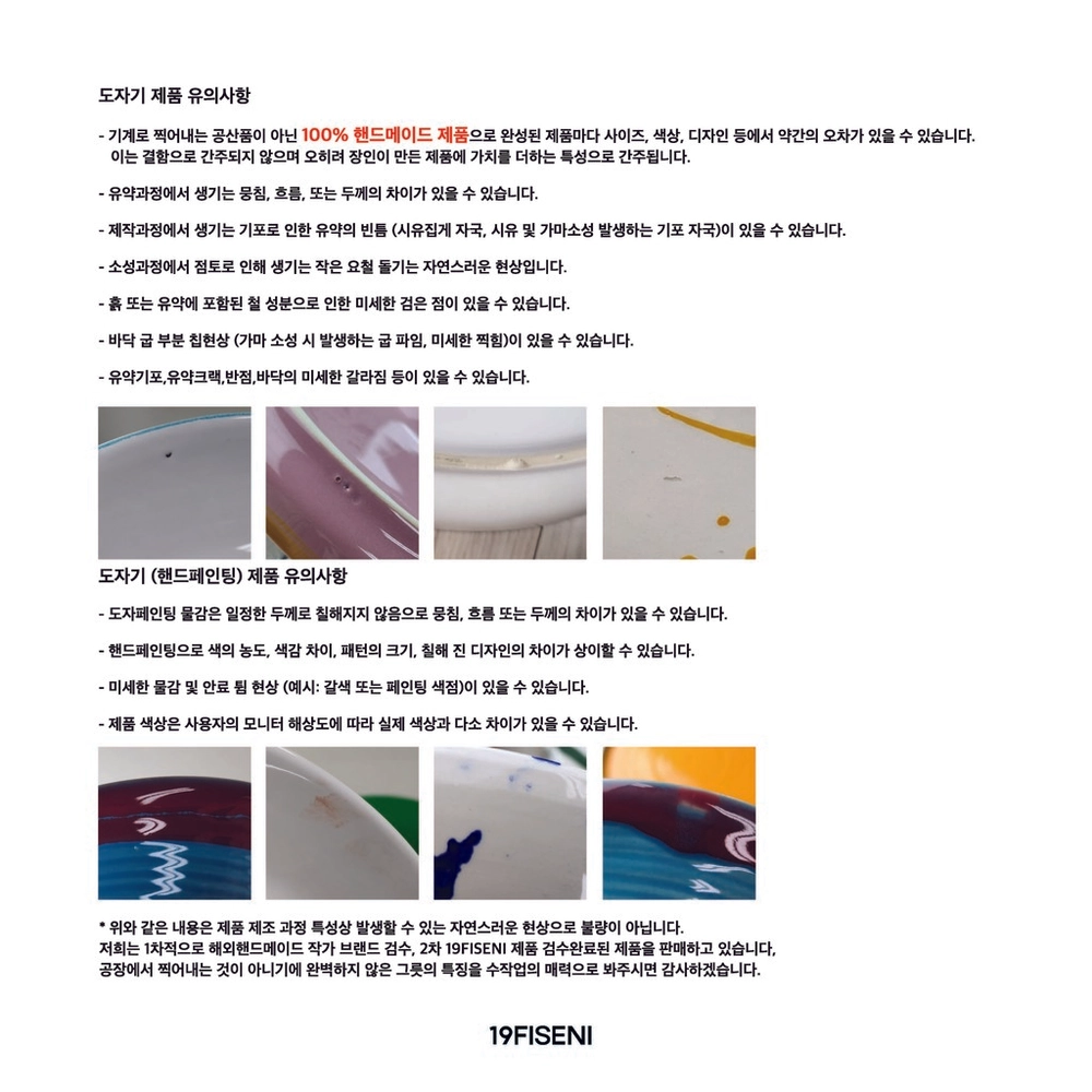 보관 및 세척 방법 - 오븐 및 식기세척기 사용이 가능합니다. - 컴퓨터, 모바일 기기의 종류에 따라 실제 상품의 색상과 다르게 보일 수 있습니다. - 제작 과정, 재는 방법에 따라 표기된 사이즈와 실측 사이즈가 상이할 수 있습니다. - 소재 특성상 발견되는 현상은 모두 정상 범주로, 교환/환불의 사유가 되지 않습니다. * 구매 전 참고하시고 신중한 구매 결정 부탁드립니다. [핸드메이드 제품 유의사항] - 기계로 찍어내는 공산품이 아닌 100% 핸드메이드 제품으로 완성된 제품마다 사이즈, 색상, 디자인 등에서 약간의 오차가 있을 수 있습니다. 이는 결함으로 간주하지 않으며 오히려 장인이 만든 제품에 가치를 더하는 특성으로 간주합니다. [도자기 제품 유의사항] - 유약 과정에서 생기는 뭉침, 흐름, 또는 두께가 상이할 수 있습니다. - 제작 과정에서 생기는 기포로 인한 유약의 빈틈(시유 집게 자국, 시유 및 가마 소성 발생하는 기포 자국)이 있을 수 있습니다. - 가마 소성 과정에서 점토로 인해 생기는 작은 요철(돌기)이 발생할 수 있습니다. - 흙 또는 유약에 포함된 철 성분으로 인한 미세한 검은 점 및 잡티가 있을 수 있습니다. - 바닥 굽 부분 칩 현상(가마 소성 시 발생하는 굽 파임, 미세한 찍힘 및 피놀자국)이 있을 수 있습니다. [도자기(핸드페인팅) 제품 유의사항] - 핸드페인팅은 일정한 두께로 칠해지지 않음으로 뭉침, 흐름 또는 두께가 상이할 수 있습니다. - 핸드페인팅으로 색의 농도, 색감 차이, 패턴의 크기 차이가 상이할 수 있습니다. - 미세한 물감 및 안료 튐 현상(예시: 갈색 또는 페인팅 색점)이 있을 수 있습니다. [유리 제품 유의사항] - 일부 제품은 마우스 블로오 공법(입으로 불어 만드는)으로 제작되어 두께, 모양이 완벽히 대칭/균일하지 않을 수 있습니다. - 제작 과정에서 줄 모양의 스크래치나 기포(공기주입 구멍) 등이 발생하는 현상을 쿼드라고 합니다. 성형 과정 중 유리가 식으면서 발생하는 자연스러운 현상입니다. - 공정 시 온도 차에 따라 발생하는 쿼드 현상으로 인한 진한 라인은 파손과 무관한 부분이며, 미세한 검은 점 및 잡티는 사진상으로 보이는 것보다 진할 수 있습니다. - 유약 과정에서 생기는 뭉침, 흐름, 또는 두께가 상이할 수 있습니다. - 가마 소성 과정에서 점토로 인해 생기는 작은 요철(돌기)이 발생할 수 있습니다. - 바닥 굽 부분 칩 현상(가마 소성 시 발생하는 굽 파임, 미세한 찍힘 및 피놀자국)이 있을 수 있습니다. - 액체 상태의 유리로 제작되는 제품 제작 특성상 마감 부분이 매끄럽지 못하고 위로 솟아올라 있거나, 아래로 내려앉아 있을 수 있습니다.